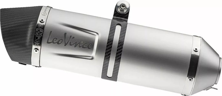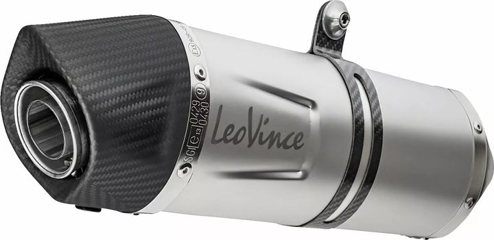 LV One Evo Stainless Steel is the synthesis between tradition and modernity., It combines the leovince classic style looks and innovation in the research of the most performing and lightweight materials., Features, aisi 304 stainless steel sleep, full carbon orb (1,650 ᄚ F), Adjustable Full Carbon Fastening Strap, Laser Etched Leovince Logo