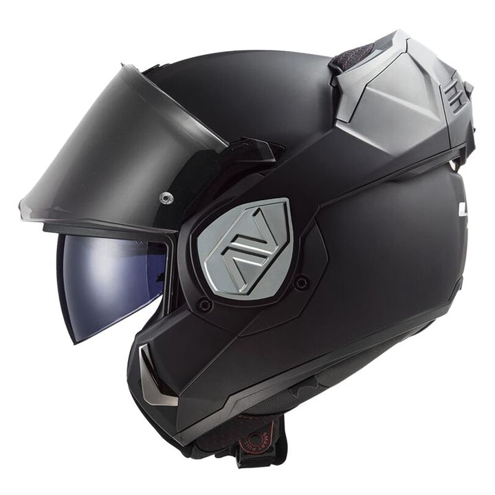 LS2 Öppningsbar Mc-Hjälm Advant Matt Svart i halvöppet läge, med integrerat solvisir och aerodynamisk form.