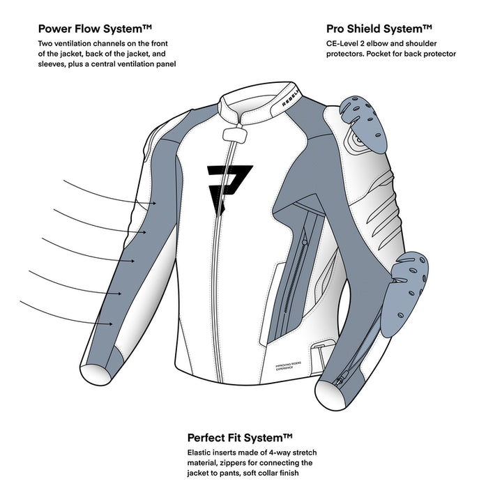 - Zippers for connection (360 ° and card) so you can switch the jacket with optional pants from Rebelhorn
