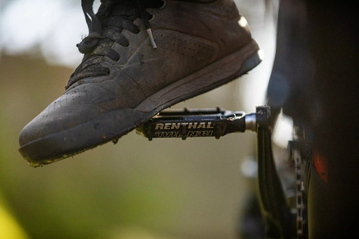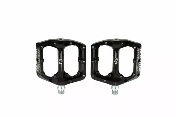 Introducing the Revo-F Flat Pedals From Renthal. , Featuring a deep concave platform, The Revo-F Offers Unrivalled Support and Traction., Large Parallelogram Body Profile., Tuneable Pin Height in 1 mm Increments from 2.5 mm to 5.5 mm., High Grade Chromoly Axle. IGUS BUSHING AND FULL CONTACT AND LOW FRICTION INboard Main Seal., Plus, fully serviceable in under 3 mins using standard tools.