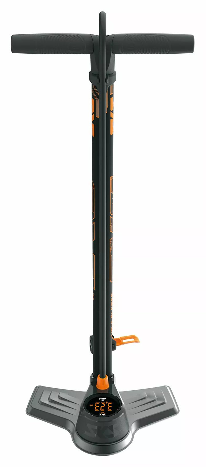 The SKS Air-X-Plorer Digi 10.0 Floor Pump Impresses with a High-Quality LED Digital Pressure Gauge. , The First-Class Sensor Technology Guarantees High Measure Accuracy and Delivers Precise Air Pressure Values ​​Up To 10 Bar (144 Psi)., Other Features Include The Soft-Touch Handle With Handle Compartment für Tyre Longs, the Extra Long High-press Valve Types., The Large Steel Tube and the Solid Metal Base Guarantee Good Power Transfer, Ensuring That Higher Pressures (476 cm³ Stroke) Can be Easily pumped into the tyres., Incl. Battery: 2 x Micro AAA., Made in Germany.