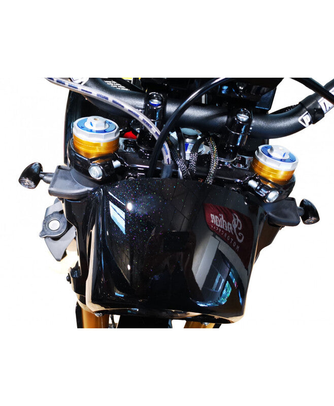 With V Parts coci002av can you easily and stylishly assemble Universal blinkers on yours Indian FTR 1200. The plates are Seed out of solid 2 mm thick steel and treated with Matt black epoxy lacquer To withstand weather and wear, while blending in perfectly with the original design.