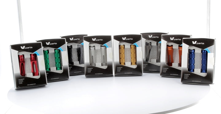 Aluminium foot pegs made from anodized CNC machined aluminium Sold in pairs Without linking All models are available in: Red Green Black Aluminum Gold Titanium Orange Blue Color: Black