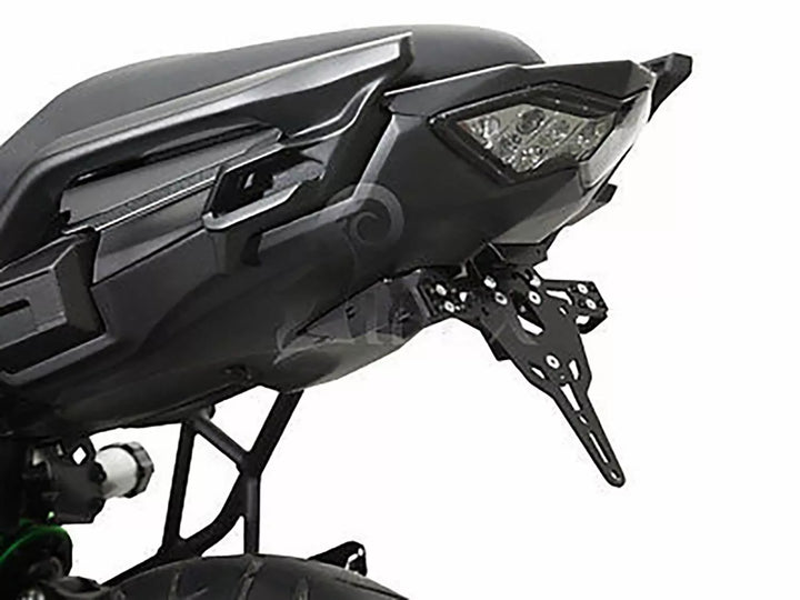 The License Plate Holder is Extremely Durable and Weather Proof., Black Powder Coated. , The License Plate Holder Can Be Used For Any Kind of License Plate (175mm Width)., No Modification of Fairing Required., Stepless Adjustment of Rake Angle., Indicator Support Adjustable in 3 Positions. Plate., Special Indicator Light Mounts (Sold Separately) Required for Stock Indicator Lights., Kit Includes: 1 License Plate Holder Incl. Mounting Kit., LED License Plate Light "e Approved" Incl. Support., Back Light With Support.