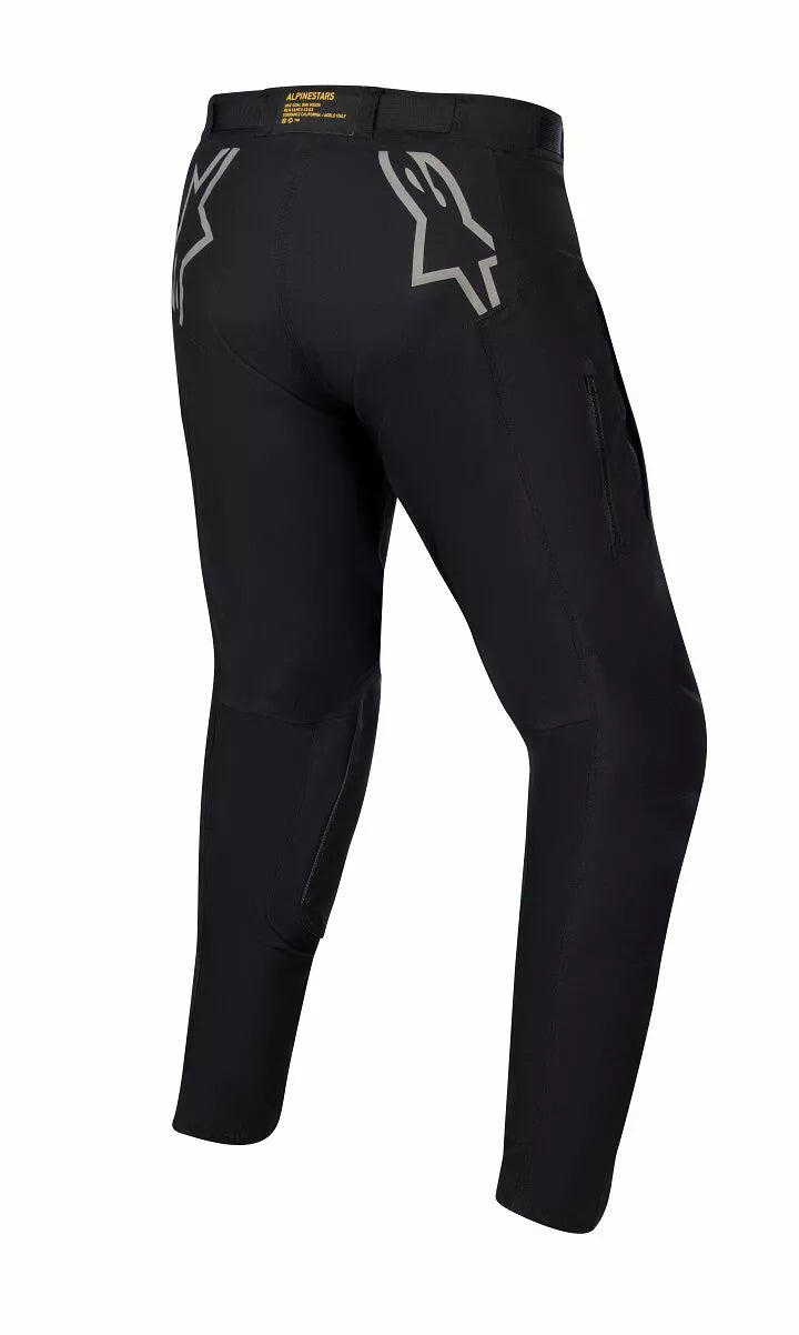 Ruged polyamidikangasmateriaali rungossa ja vuohenahkalla sisäpolvissa kestävyyden saavuttamiseksi. , Hengittävä ja joustava Netwet -materiaali jalkojen takana mukavuutta varten., Reiteen avoimia tuuletusaukkoja ylimääräistä ilmanvaihtoa varten. Suunniteltu sopimaan Alpinestarsin polvensuojaimien yli.