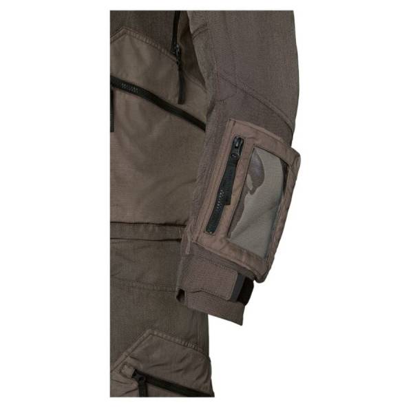 Takki on tehty yhtenä Erittäin kestävä ja tuulettava polyamidipuomi kangas, mikä tekee siitä sekä kestävää että mukavaa lämpimämmissä lämpötiloissa. Sateen ja kylmän mukaan erillinen Vedenpitävä Gore-Tex®-ulkotakki (Vedenpitävä 28 000 mm), joka vedetään helposti ulkopuolelle täydellisen suojan aikaansaamiseksi tuulta ja märkää vastaan.