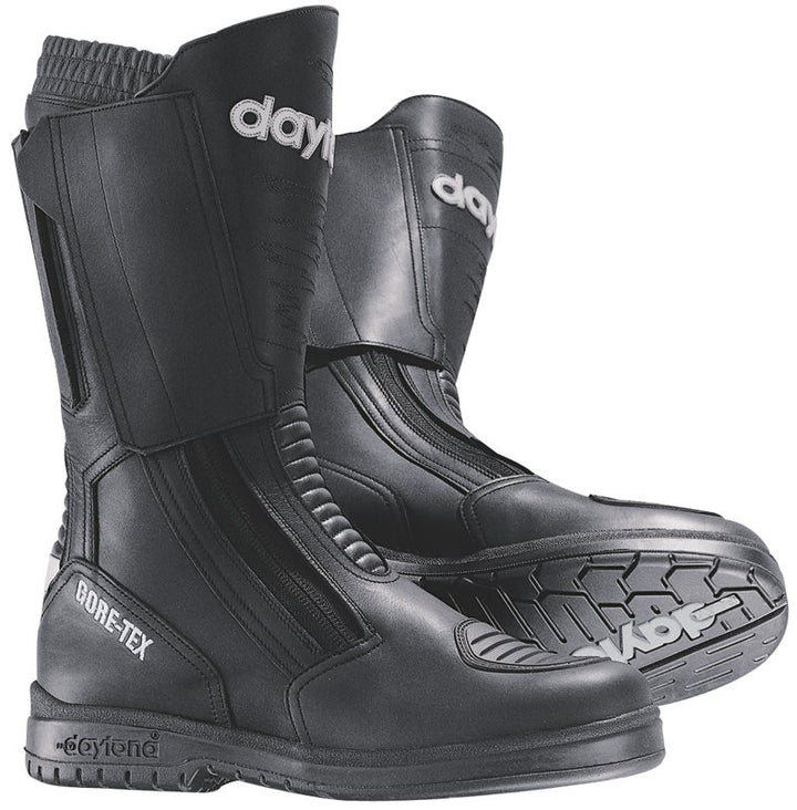 Täydellinen touring-saapas, jossa on korkea varsi, joka on kestävä mutta silti kevyt ja mukava. Saappaassa on öljytystä vedenpitävästä vahvasta täysnahasta valmistettu päällinen, ja se on varustettu vedenpitävällä ja hengittävällä GORE-TEX® kalvolla sekä tekstiilivuorilla (80 % polyamidia / 20 % polyesteria). Kaksois-tarranauh säätö varressa mukauttaa pohkeen leveyttä, ja sulkeminen tapahtuu kaksoisketjuilla helpottamaan sisäänkäyntiä. Nahkavuori varren sisäpuolella ja vahvistus kestävästä PU-vaahtomuovista vaihdevivun kohdalla sekä anatomisesti muotoiltu ilmastointipohjallinen. Suojus säärille lateksipehmusteella sekä nilkkasuojus molemmilla puolilla, jotka on pehmustettu erikoisvaahtomuovilla, jossa on avoimia soluja. Välikerros PU-vaahtomuovista ja muovista, jota on vahvistettu galvanoidulla teräksellä, mikä tekee siitä vääntöjäykän mutta silti käveltävän. Varustettu 3M-Scotchlite heijastimella sekä pehmeällä touring-pohjalla, joka on myös liukastumisenkestävä. Varren korkeus noin 34 cm.
