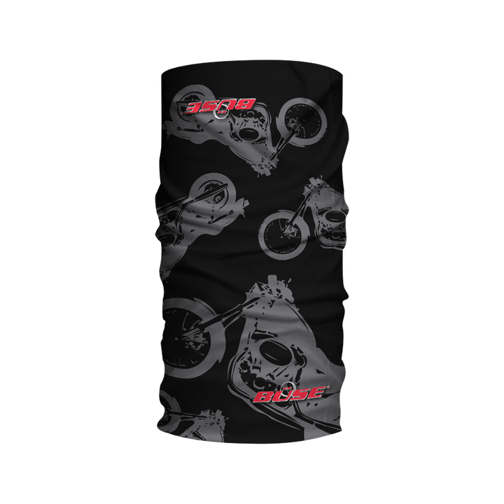 BÜSE Halskrage Tuch Büse Svart med motorcykelmotiv och röd logotyp. Multifunktionell tubhalsduk för skydd och stil vid motorcykelkörning.