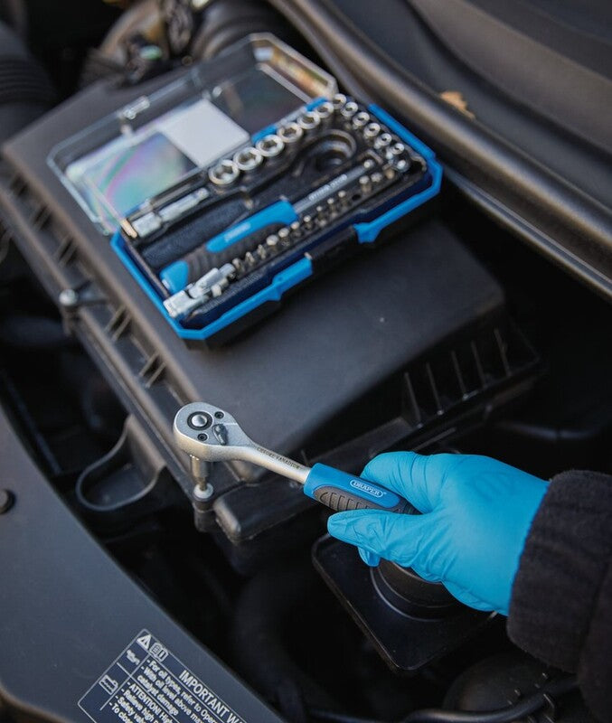 Tämä 1/4 "neliömetriä Dr. Socket Set sisältää 146 mm 72-over-oven palautuvan pikavapauden räikkän sekä valikoiman pistorasiat, ruuvimeisselibittejä ja kuusiavaimia. Kaikilla tämän sarjan työkaluilla valmistetaan HACE-askeita ylimääräisen otteen saavuttamiseksi. Ruuto ja kehruu molemmilla on pehmeä tarttuva mukavuuden aikana pitkittyneenä.