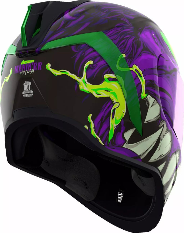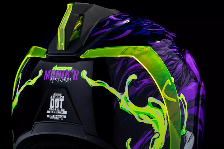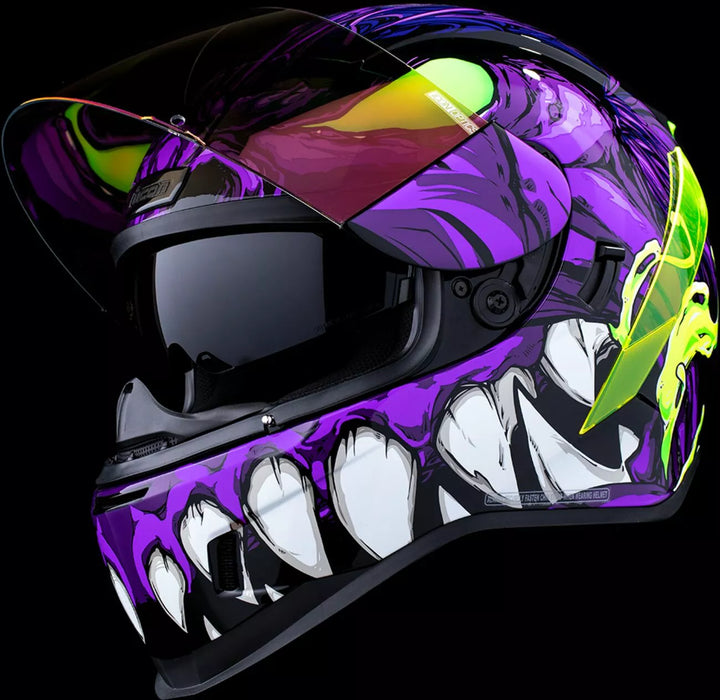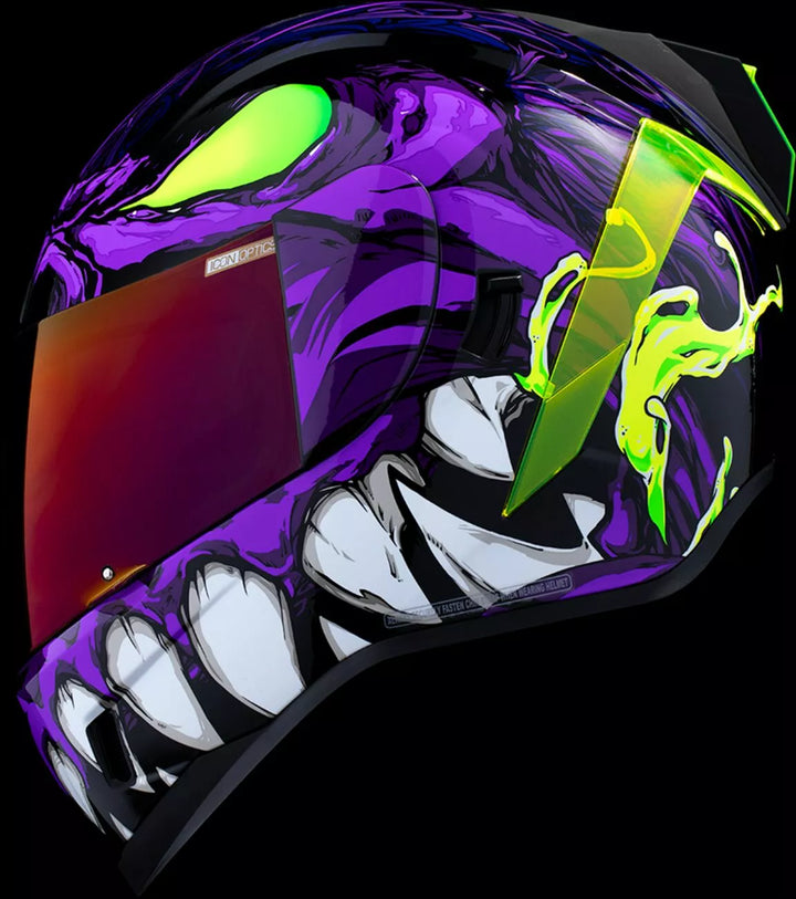 Jatkuva tuuletusjärjestelmä, FAG-Free Icon Optics ™ -suoja Rapid-Release ™ -järjestelmällä, injektiovalettu polykarbonaattikuorella lujuutta varten, sisäinen ilmavirtageometria, veistetty kaularulla, prolock ™ switsch, lukitusvaiheessa oleva swequor-visiori on käytettävä vain, kun päähenkilö on täysin suljetussa asennossa, remov-muovattua hengitystä, removice-vetypesää. Liner, sisäiset kaiutintaskut toimivat ICON: n R.A.U. Bluetooth -laite sisältää Dark Smoke Dropshield ™ ja Rubatone Black SpeedFin ™