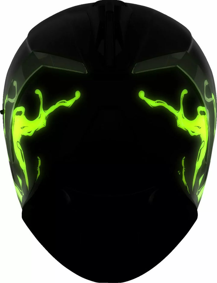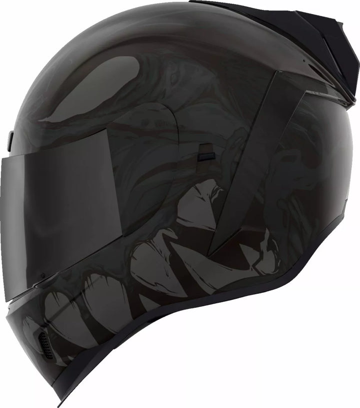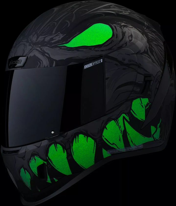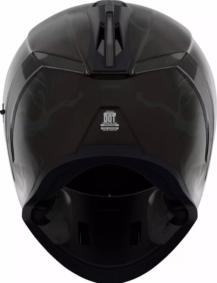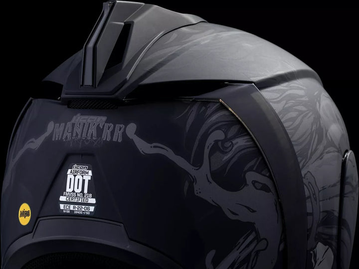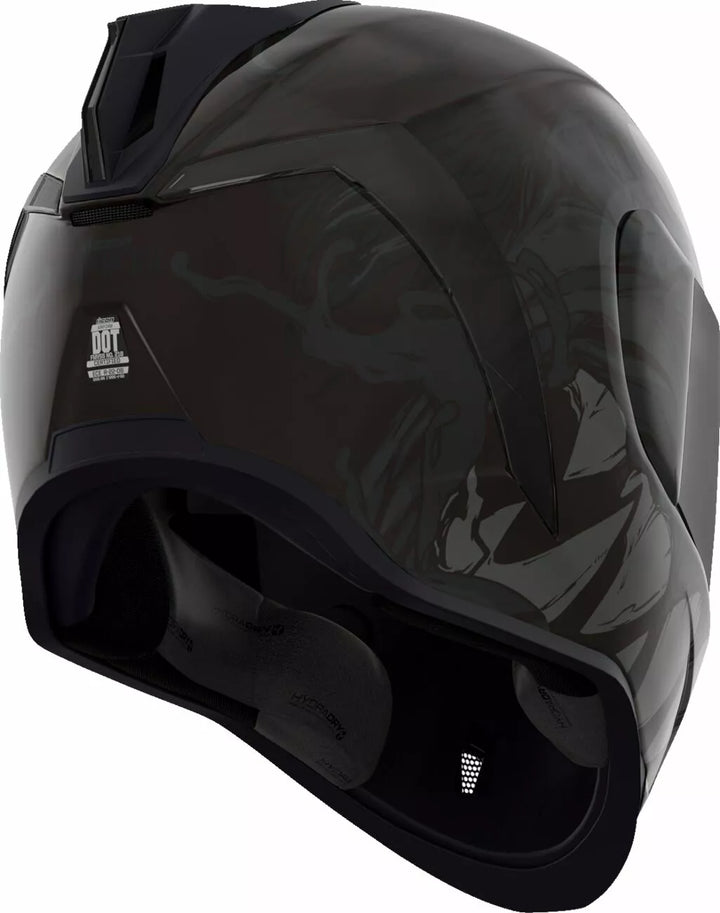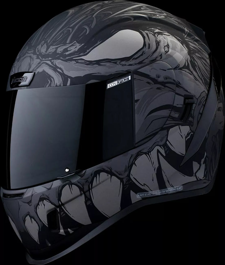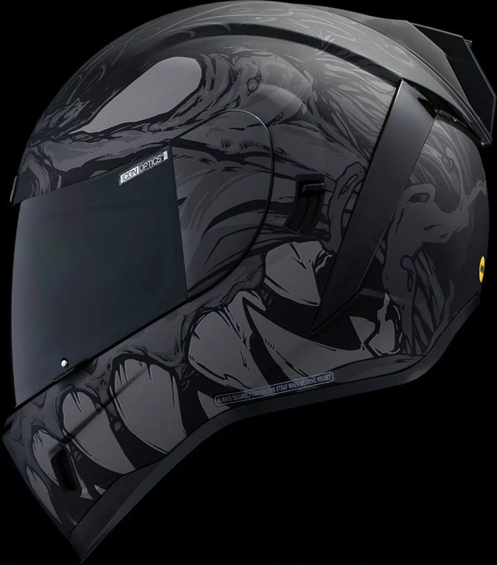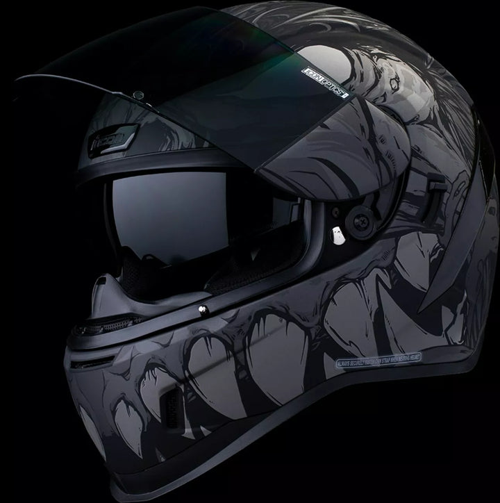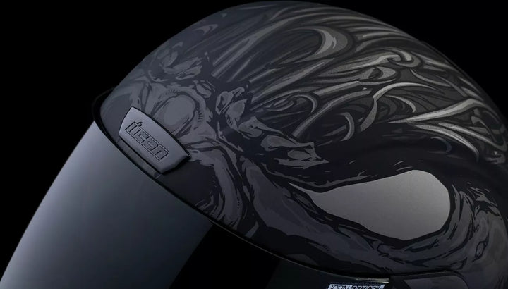 Jatkuva tuuletusjärjestelmä, FAG-Free Icon Optics ™ -suoja Rapid-Release ™ -järjestelmällä, injektiovalettu polykarbonaattikuorella lujuutta varten, sisäinen ilmavirtageometria, veistetty kaularulla, prolock ™ switsch, lukitusvaiheessa oleva swequor-visiori on käytettävä vain, kun päähenkilö on täysin suljetussa asennossa, remov-muovattua hengitystä, removice-vetypesää. Liner, sisäiset kaiutintaskut toimivat ICON: n R.A.U. Bluetooth -laite sisältää Dark Smoke Dropshield ™ ja Rubatone Black SpeedFin ™