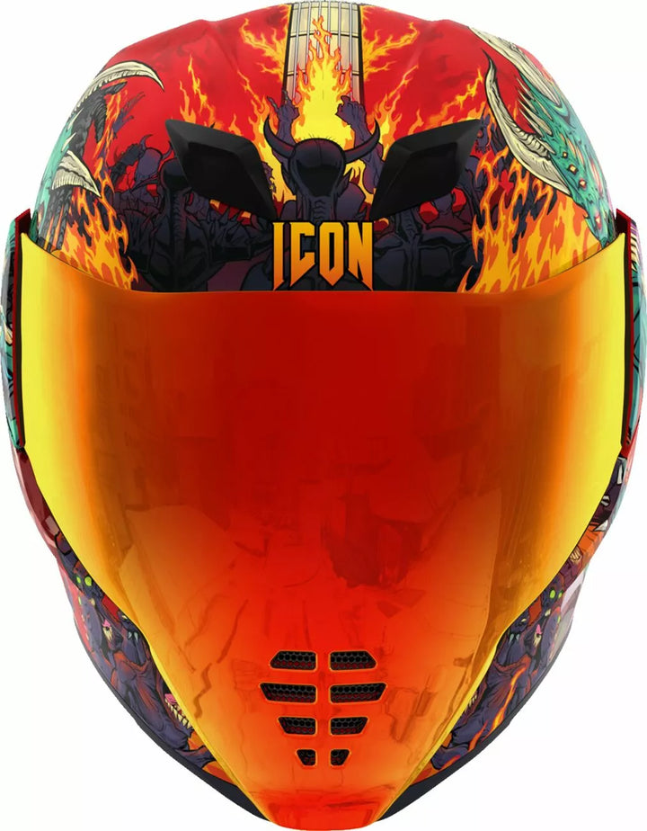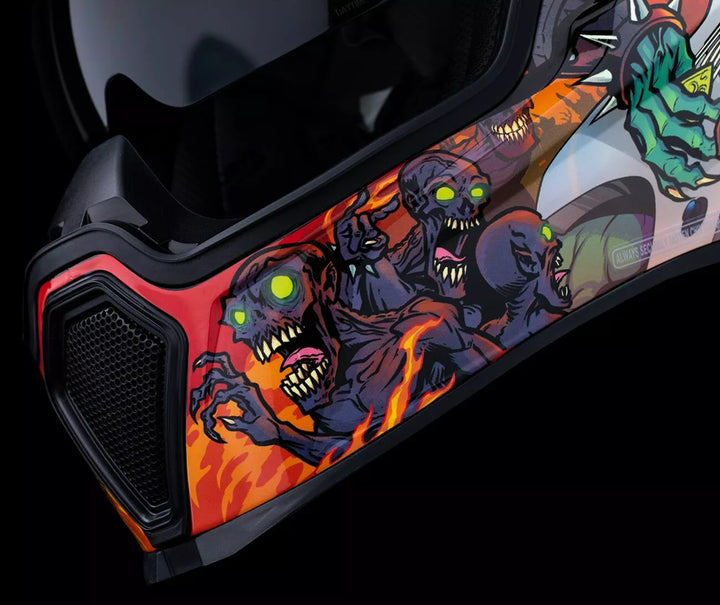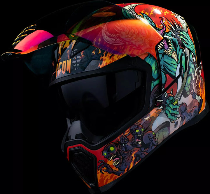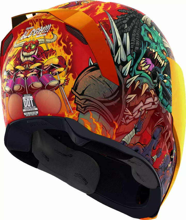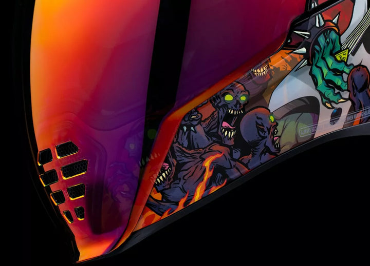 Irrotettavan valettu hengityksen ohjaaja ja leukaverho, injektiovalettu polykarbonaattikuori lujuutta varten, fag-vapaa Dropshield ™ ulkokytkimellä, upotettujen kaksikanavan superventtien jäähdytysjärjestelmä, useita ylimitoitettuja imuporttien sivulevyjä, Dropshield ™ -visuoria on käytettävä vain, kun pääpinnan kilpi on täysin suljetussa asennossa, sisarausaineena, internointihydradres ™ ICON: n R.A.U. Bluetooth-laite, sisältää selkeän ja ensimmäisen auringonlaskun sumuvapaan fliteshield