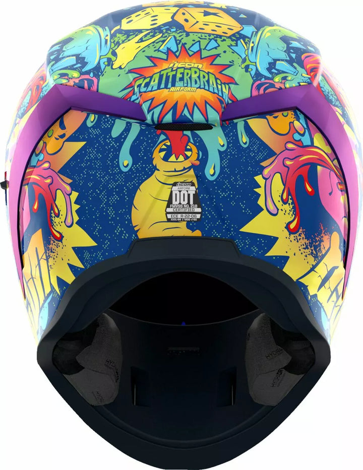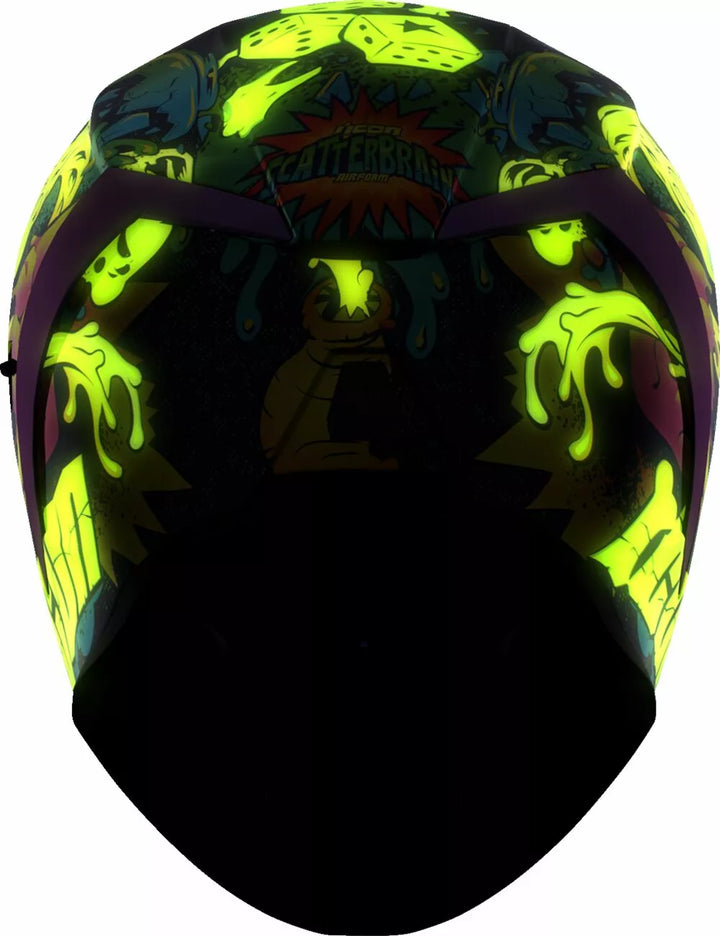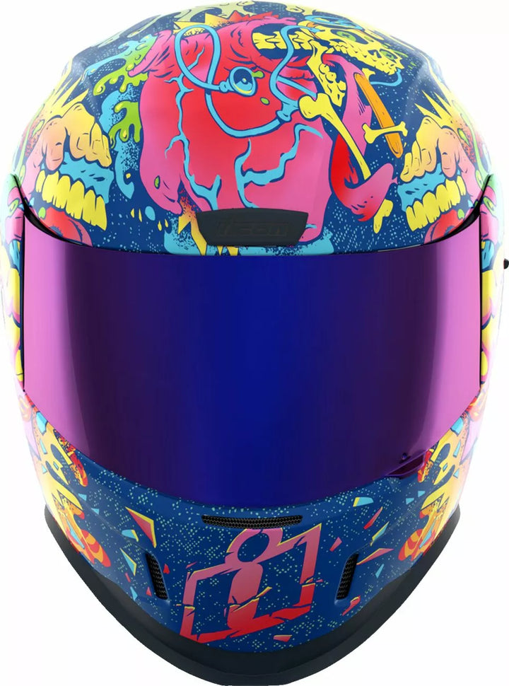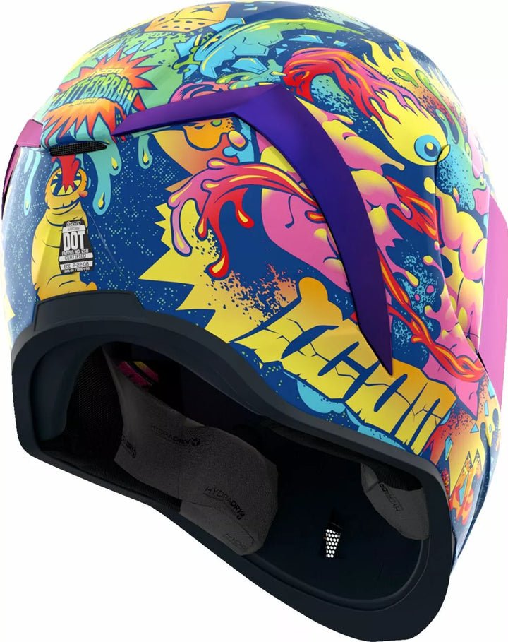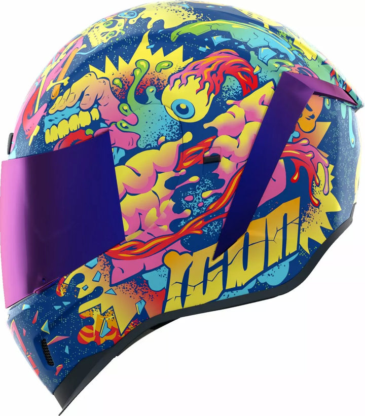 Injektiovalettu polykarbonaattikuori lujuuden, sisäisen ilmavirran geometrian, jatkuvan tuuletusjärjestelmän, sculpeed-kaularullan, fag-free Icon Optics ™ -suojan kanssa Rapid-Reale ™ -järjestelmän kanssa, Prock ™ Positiivinen Shield ™ -kirjoitusjärjestelmä, sisäistä tippaa korkeaa visiiriä on käytettävä vain, kun taas päähenkilö on täysin suljetussa asennossa. Kaiutintaskut toimivat ICON: n R.A.U. Bluetooth -laite, sisältää Dark Smoke Dropshieldin, sisältää Clear & Rst Purple Optics Shield ™