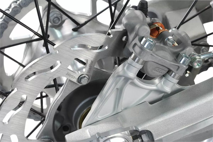 MX/offroad-sovittimen kiinnike on tarpeen asentaa ylisuuri etulevyn levy, hakasulkeet ovat täysin CNC-koneistettuja 6082 billet-alumiinia ja niitä käytetään siirtämään osakejarrujen paksuus oikeaan asentoon ylisuuren levyn sijoittamiseksi