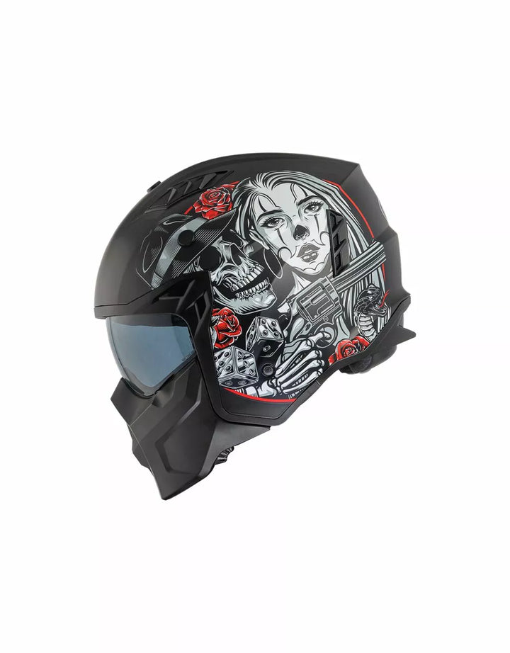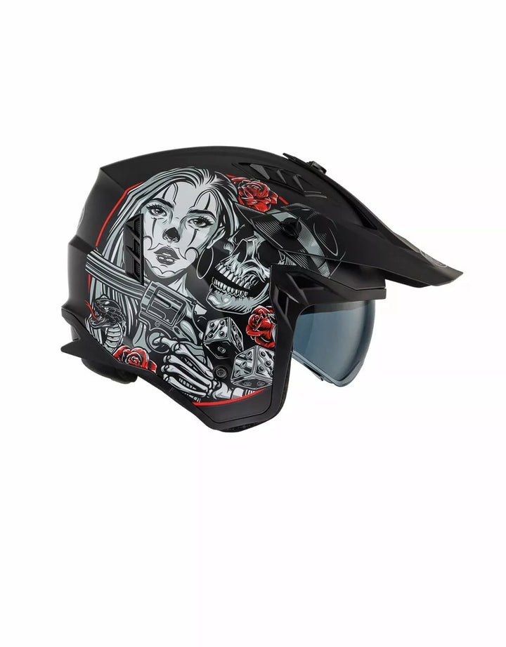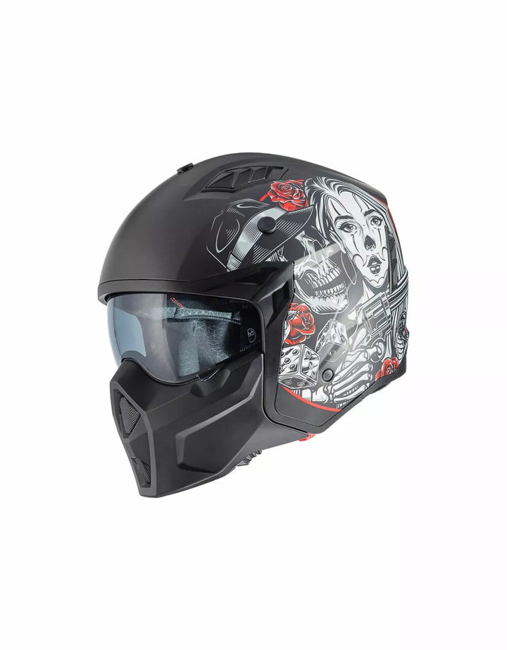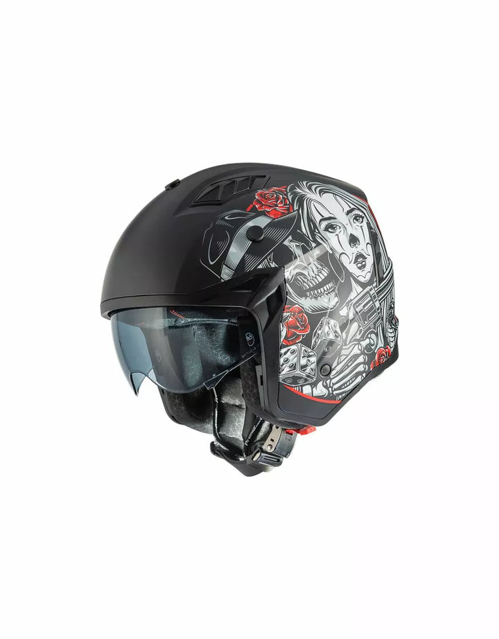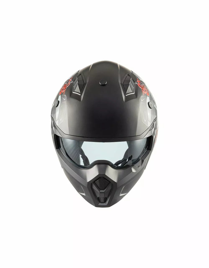 Termoplastinen ulkorakenne on kevyt ja sisärakenne on valmistettu EPS-materiaaleista, joiden tiheys vaihtelee alueen riippuen, iskuvasteen varmistamiseksi. Ominaisuudet irrotettava leuka-osio tämän täyssivuston kypärän kääntämiseksi suihkukipärään. , Visiiri on injektiovalettu läpinäkyvä polykarbonaatti ja sillä on tarkkailukäsittely. , Sisäinen visiiri toimii kuten aurinkolasit ja sitä voidaan nostaa kuoren sisällä. Tuuletusjärjestelmänä on kaksi ilmanottoaukkoa kuoren yläosassa ja kaksi takaosassa olevaa uuttolaitetta. Sisätilojen sijoittaminen on suunniteltu jättämään näkymä leveäksi ja liikkumisen tunteeseen. , Sisätilat ovat irrotettavissa, pestävää ja tehdään hypoallergeenisiksi desinfioidulla hoidolla.