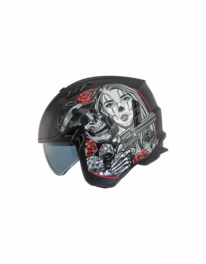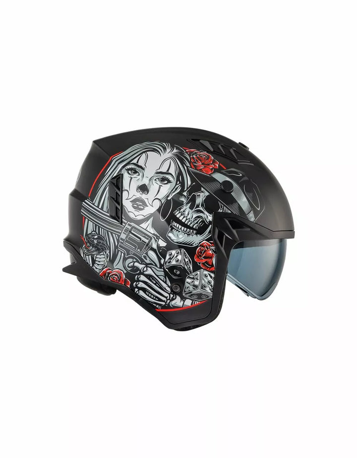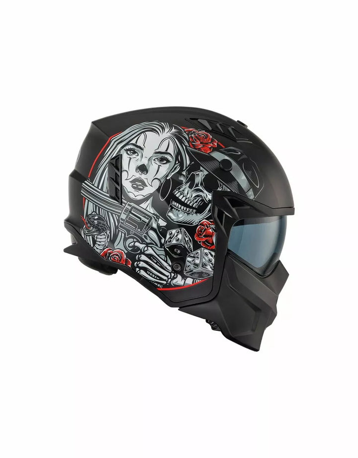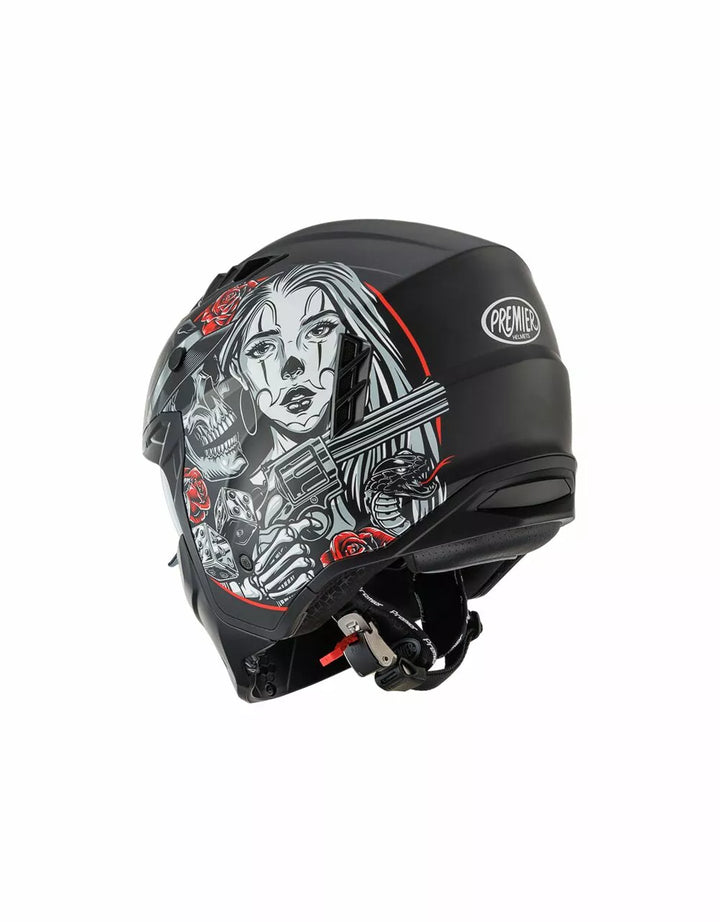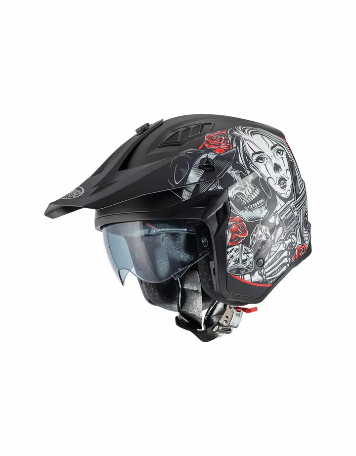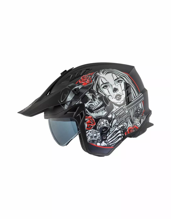 Termoplastinen ulkorakenne on kevyt ja sisärakenne on valmistettu EPS-materiaaleista, joiden tiheys vaihtelee alueen riippuen, iskuvasteen varmistamiseksi. Ominaisuudet irrotettava leuka-osio tämän täyssivuston kypärän kääntämiseksi suihkukipärään. , Visiiri on injektiovalettu läpinäkyvä polykarbonaatti ja sillä on tarkkailukäsittely. , Sisäinen visiiri toimii kuten aurinkolasit ja sitä voidaan nostaa kuoren sisällä. Tuuletusjärjestelmänä on kaksi ilmanottoaukkoa kuoren yläosassa ja kaksi takaosassa olevaa uuttolaitetta. Sisätilojen sijoittaminen on suunniteltu jättämään näkymä leveäksi ja liikkumisen tunteeseen. , Sisätilat ovat irrotettavissa, pestävää ja tehdään hypoallergeenisiksi desinfioidulla hoidolla.
