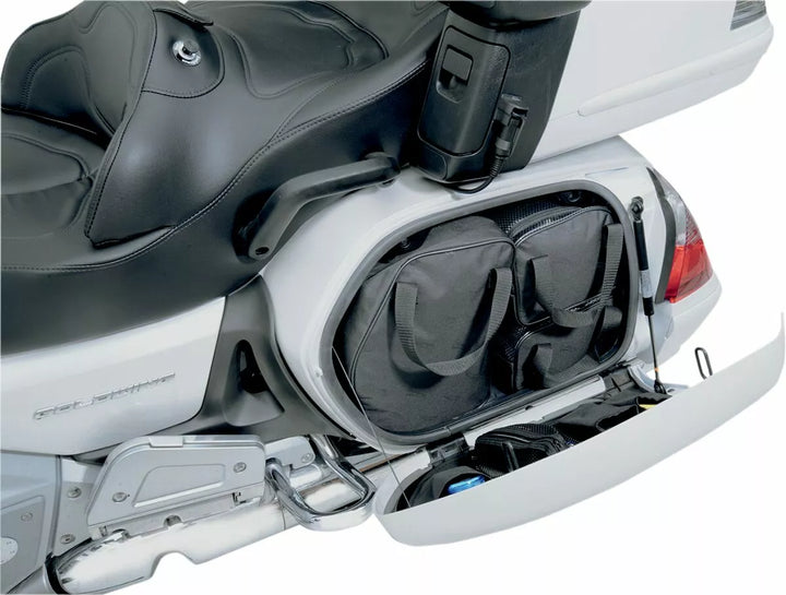 Neljän kappaleen linjasarja sisältää yhden täysikokoisen vuorauspussin, joka on sovitettu täydellisesti GL1800-satulalaukkuun plus yhden pystysuoraan suuntautuneen puolikokoisen linja-autoon, jota käytetään yhdessä kahden neljänneskokoisen vaakasuunnassa suuntautuneen vuorauspussien kanssa, jotka pinoavat siististi toiseen satulalaukkuun, ainutlaatuiseen suunnittelun käyttöoikeuteen ja jako-asunto-asuntosi ja jakoon. Saddlepussit, Quicter -koottujen vuorauspussien yläosat ovat transparteja ja näet, että kärjessä on, että tansseja, jotka ovat täydellisiä tuotteille, jotka sinun on tartuttava tiellä, valmistettu kevyistä, mutta kestävistä PVC: stä, joka on linjassa 150 -MENIer -polyesterin kanssa. Yöllä yöt, jotka järjestävät vuorat satulalaukkuista siirtääksesi lastiasi helposti hotelliin, leirintäalueelle tai purkaaksesi kiinteä, kun olet kotona, laukut mitat: Täydelliset sarjat: 19 "x 7" x 12 "(suurempi vuoraus); 9" x 7 "x 5-1/4" (keskipitkä linja); 9 "x 7" x 6-1/4 "(pieni vuoraus)