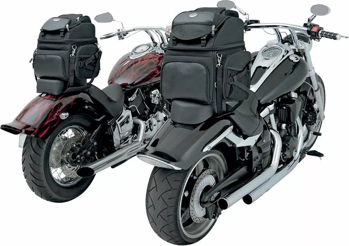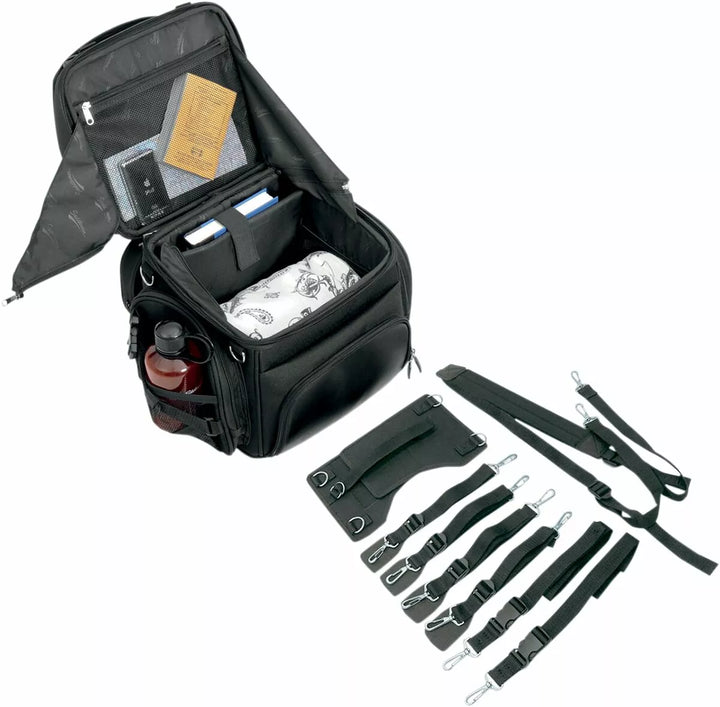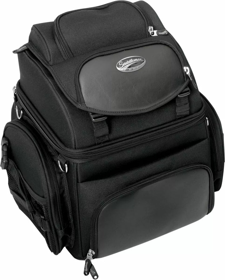 Kaksi asennusjärjestelmää sisälsi: Saddlemenin "Versan-Mount" -kappaleiden ja valjaiden ala-istuimen ja valjaiden ja säädettävä Sissy Bar -hihnajärjestelmä, joka kiinnittää pussin helposti moottoripyörän istuimeen, matkalaukkuun tai Sissy Bar, selkänojaalustaan voidaan säätää irrotettavissa olevia tautien hihnoja, joilla on helppo organisaatiotaskussa, viisi ulkoista poimua Lisätty kapasiteetti, viisi sisäistä ja kahta ulkotaskua, elementit, ylin ulkopinta voidaan säätää takin kantamiseksi, mini-padlock, ylimääräisillä näppäimillä, auttaa varmistamaan tavarat laukussa, sisäisen rakenteen mainan mainan muodon ja on riittävän vahva nojaamaan, vaikka WEPS 11 "tuuman lastin kapasiteetti; pitää yhden 3/4 kypärän plus -sarjan. Korkeus x 25,40 cm syvyys.