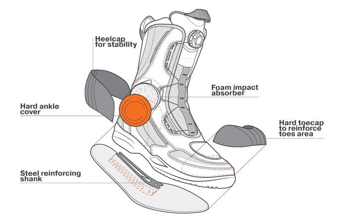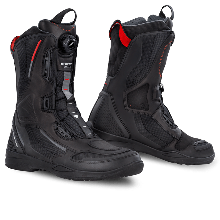 Shima Strato -kengät painaavat vain 702 grammaa, mikä vaikuttaa merkittävästi moottoripyörän ajamisen mukavuuteen. Jalkineet käyttävät SAP ™ -suojausta ja ArmorPlus -iskunvaimennusta. Vahvistettu kantapää, nilkat ja varpaat sekä erityinen ristikunnattu pohja tarjoaa helpon vakautumisen moottoripyörän tasapainottaessa. Ei -liukuva, kumitettu tyyny helpottaa vaihtamista jopa vakavissa sääolosuhteissa. Vahvistus tässä paikassa estää kenkiä käyttämästä liian nopeasti, vähentäen vammojen riskiä ja lisää siten sen käyttöikää.