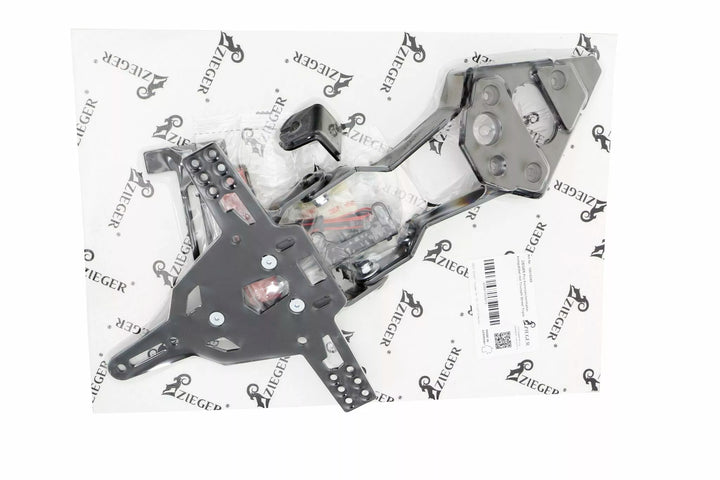 Rekisterikilven pidike on erittäin kestävä ja sääkestävä., Musta jauhemaalattu. , Rekisterikilven haltijaa voidaan käyttää minkä tahansa tyyppiseen rekisterikilpiin (175 mm leveys)., Vaaditaan muutosta., ARKE -kulman säätö. Levy., Erityiset merkkivalot (myytävät erikseen), joita vaaditaan varastossa oleville merkkivaloille., Kakkaus sisältää: 1 rekisterikilven pidike, mukaan lukien. Asennussarja., LED -rekisterikilpi Light "E hyväksytty" mukaan lukien. Tuki., Takaisin valo tuella.